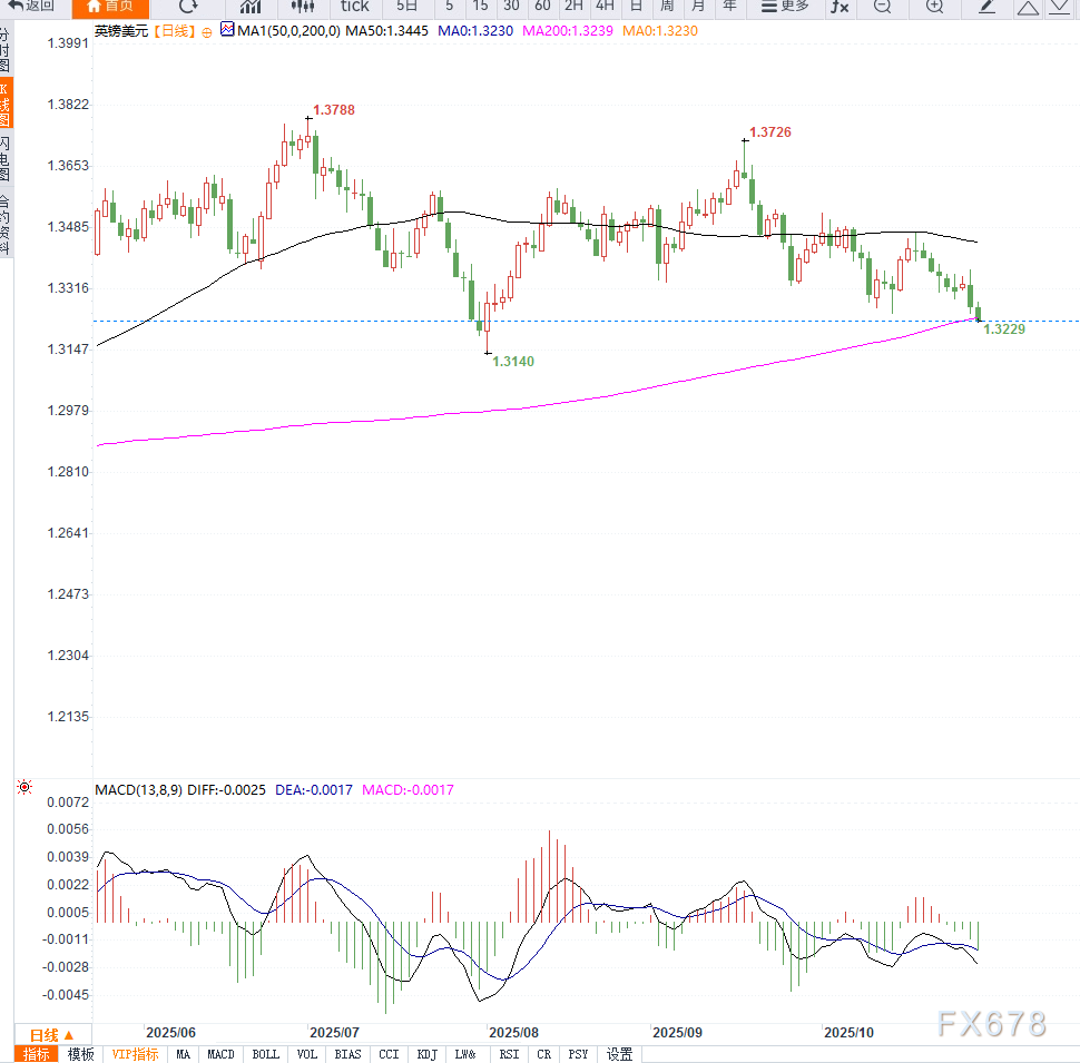 从日线图形来看,英镑兑美元正处于短线下行通道中。汇价在1.3300附近形成阶段性阻力,而下方支撑位位于1.3200整数关口。若该支撑被有效跌破,可能进一步测试1.3150和1.3080区域;